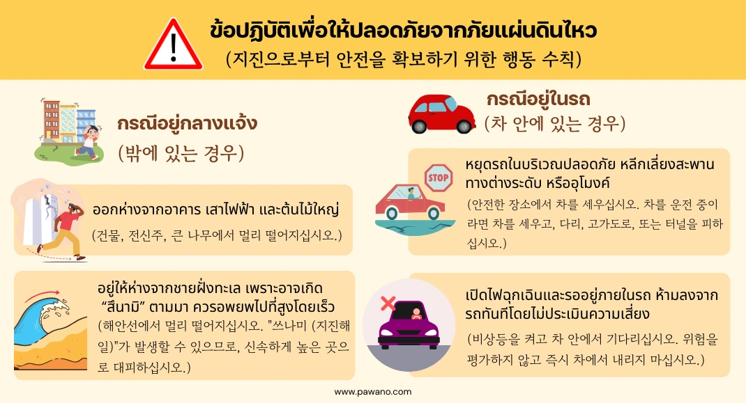 - ออกห่างจากอาคาร เสาไฟฟ้า และต้นไม้ใหญ่ พื้นที่โล่งคือจุดที่ปลอดภัยที่สุดในขณะเกิดแผ่นดินไหว
